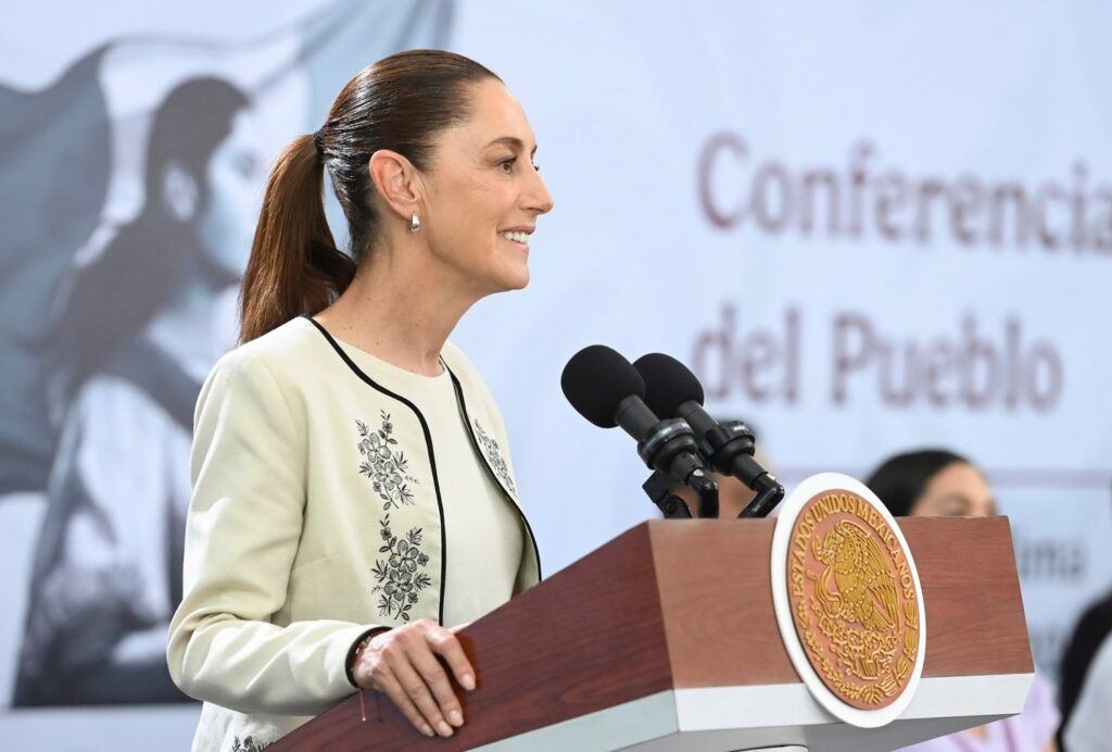 La doctora Claudia Sheinbaum Pardo, presidenta Constitucional de los Estados Unidos Mexicanos en conferencia de prensa matutina, “Conferencia del Pueblo” desde Colima. La acompañan Indira Vizcaíno Silva, gobernadora Constitucional del Estado de Colima; Omar García Harfuch, secretario de Seguridad y Protección Ciudadana (SSPC); Raymundo Pedro Morales Ángeles, secretario de Marina (Semar); Bulmaro Juárez Pérez, divulgador de lenguas originarias, pr