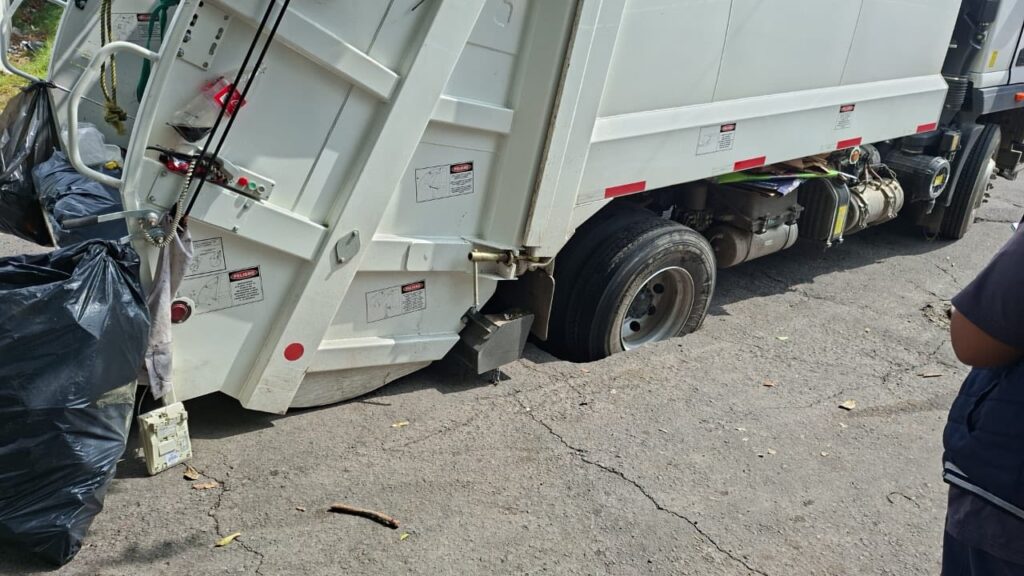 Testigos mencionaron que al pasar por la zona el pavimento cedió, provocando que la unidad quedara parcialmente hundida en el socavón. Tras lo ocurrido, los trabajadores solicitaron apoyo a su base y, minutos después, arribó personal de limpieza junto con dos unidades de trascabo, con las cuales efectuaron las maniobras necesarias para liberar el vehículo.