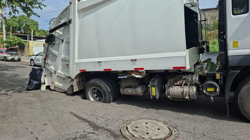La mañana de este lunes, un camión recolector de basura cayó en un hoyo ubicado en el cruce de Canal y Calle 8, en la colonia 21 de Abril, mientras realizaba su recorrido habitual de recolección.