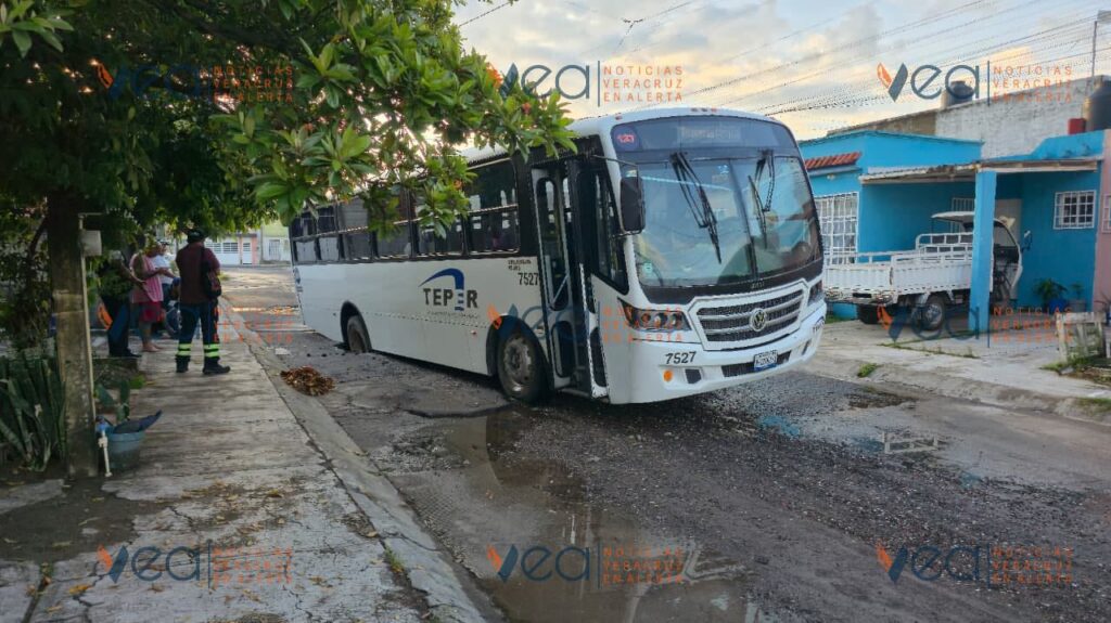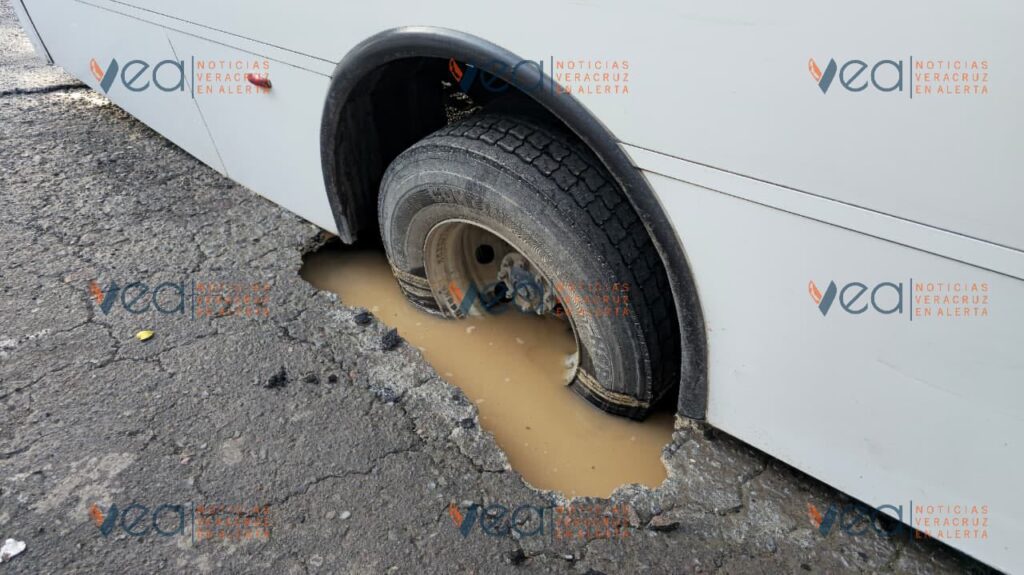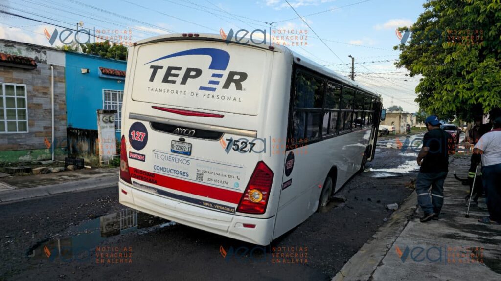 La mañana de ayer domingo, un autobús de transporte de personal con número económico 7527 cayó en un socavón formado sobre la calle Santa Catalina, entre San Martín de Porres y San Mateo, en el fraccionamiento La Parroquia de la ciudad de Veracruz.