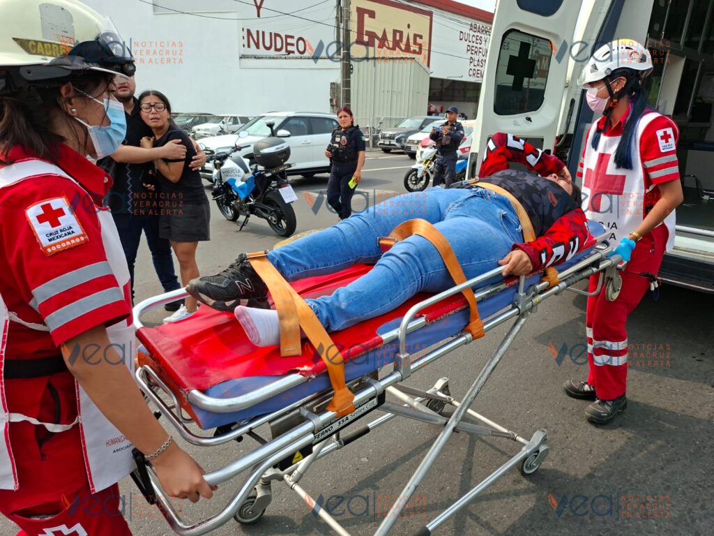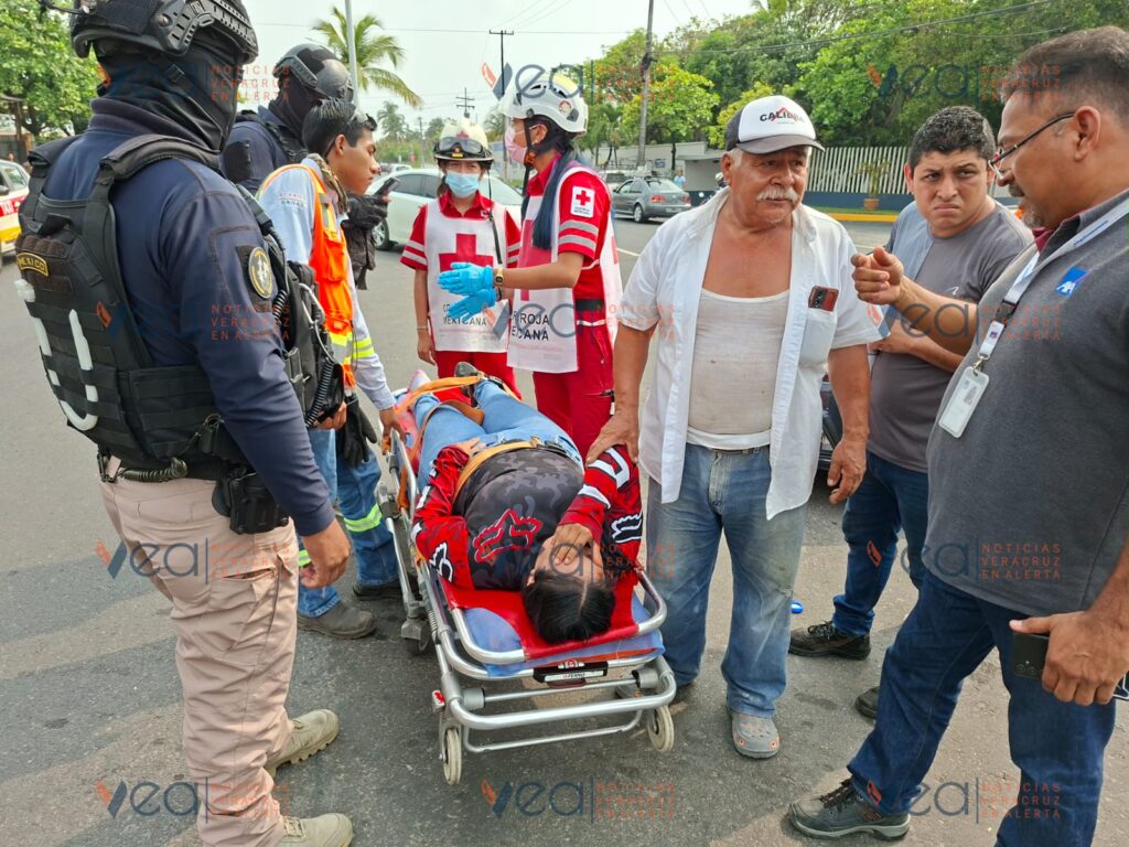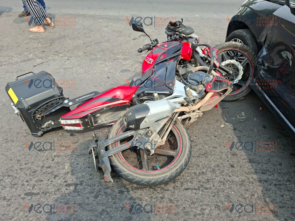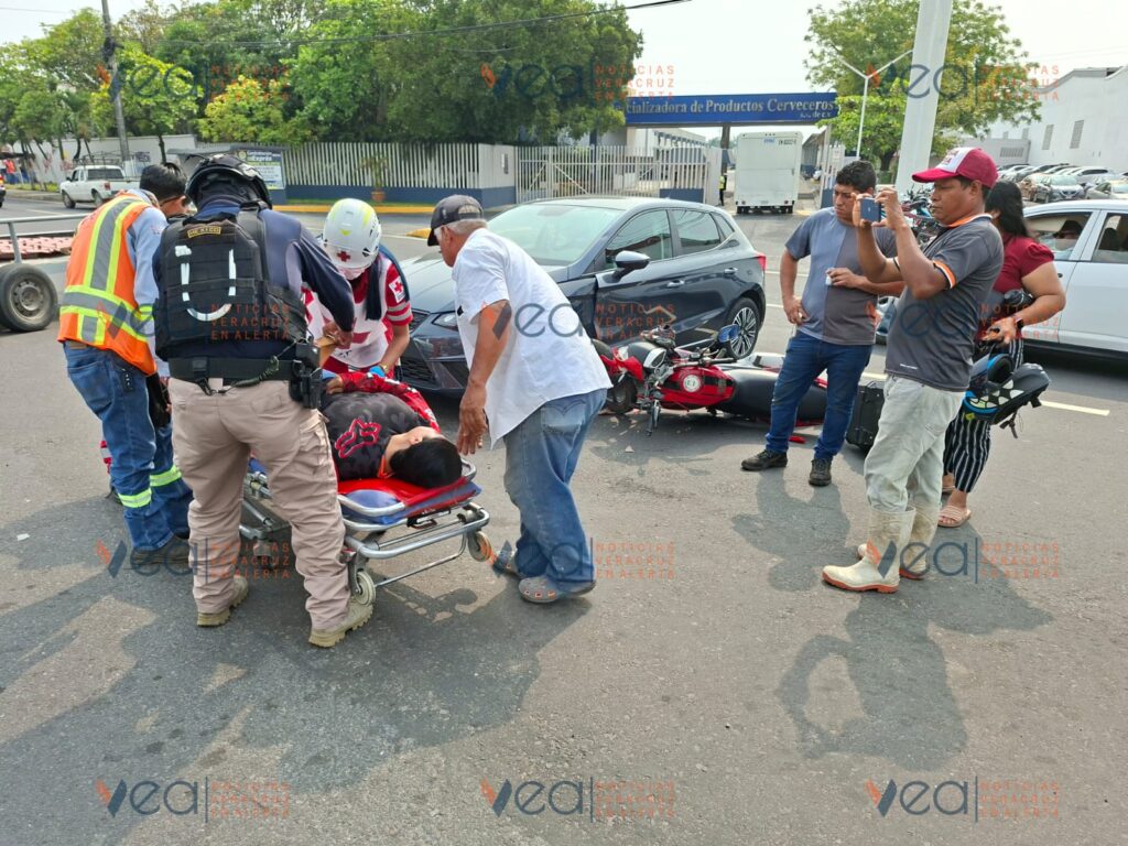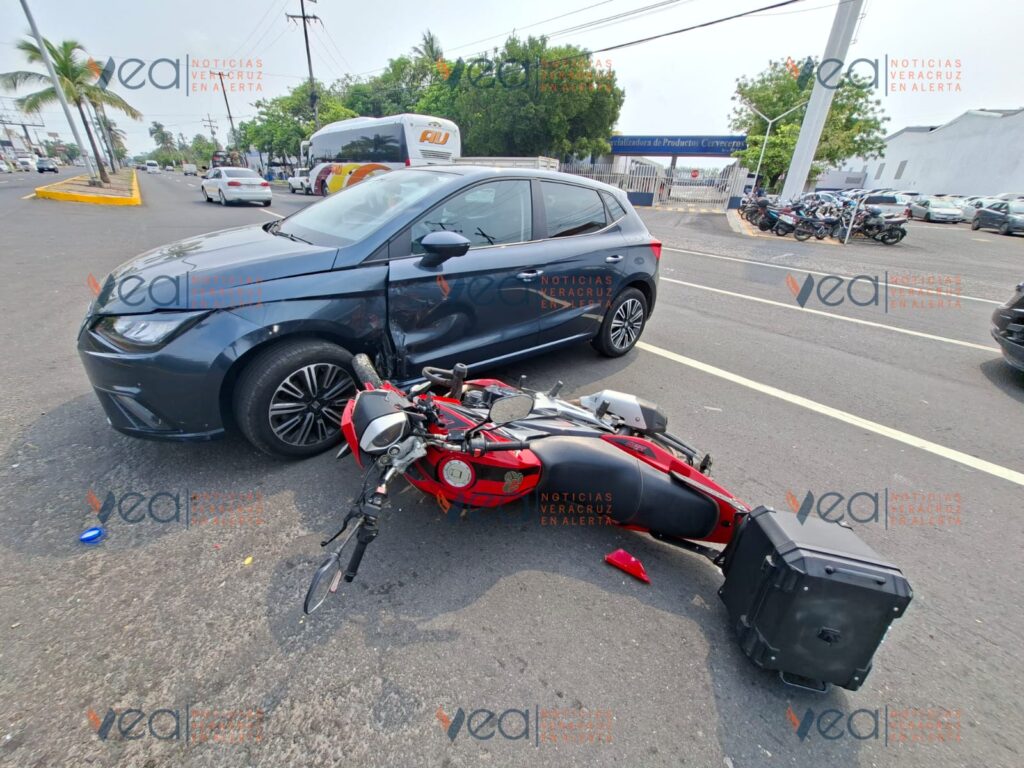 Una joven motociclista resultó lesionada la mañana de este sábado tras chocar contra un automóvil particular sobre la avenida Miguel Alemán, frente a las instalaciones de la Corona en la ciudad de Veracruz.