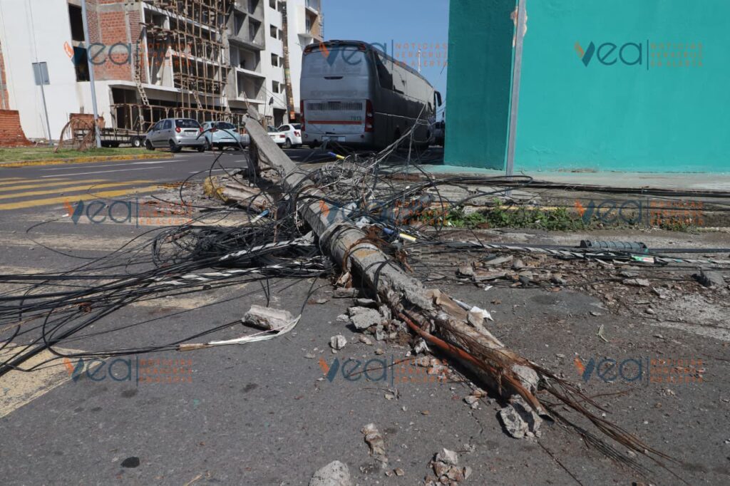 La tarde de este sábado, en la calzada Reyes Heroles, entre la calle 12 y el bulevar Ávila Camacho, en el fraccionamiento Costa Verde, dos postes colapsaron y varios cables quedaron esparcidos sobre la banqueta luego de que un autobús se enredara con el cableado y lo jalara accidentalmente.