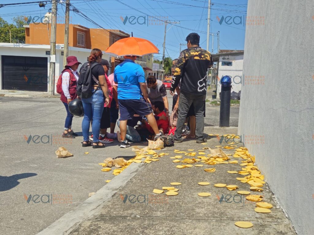 Tras el choque, el motociclista perdió el control de la unidad y terminó estrellándose contra la esquina del cruce. El conductor, quien se desempeña como tortillero, quedó tendido boca arriba con la motocicleta encima, mientras que el producto que las tortillas quedaron regadas sobre la banqueta.