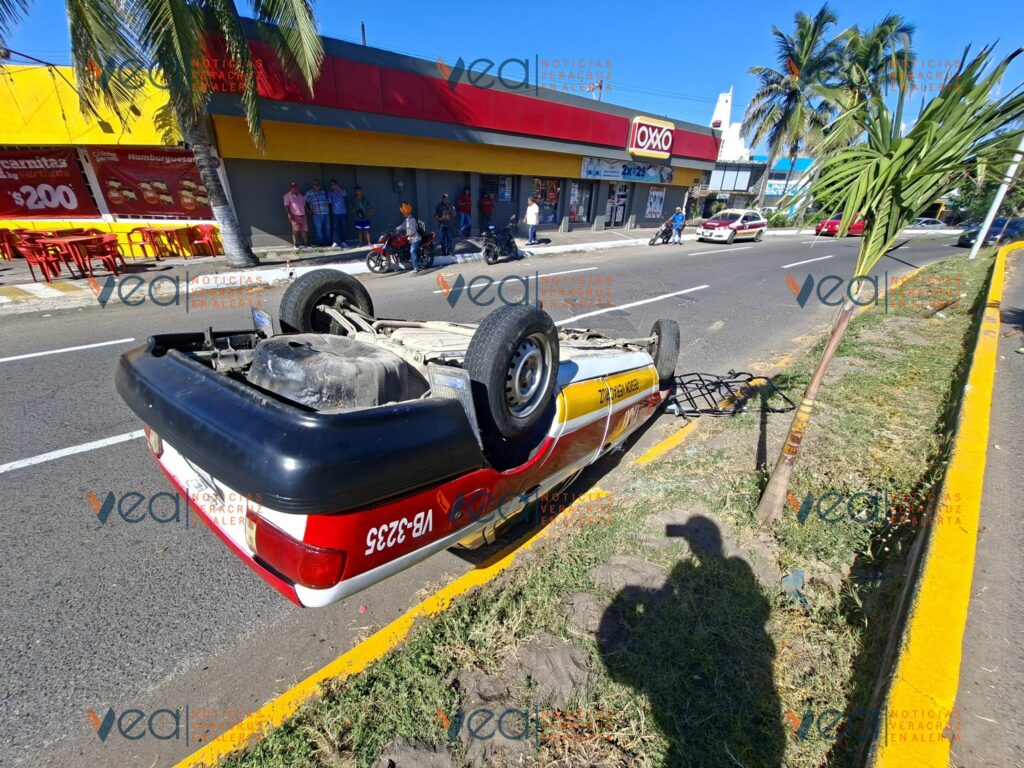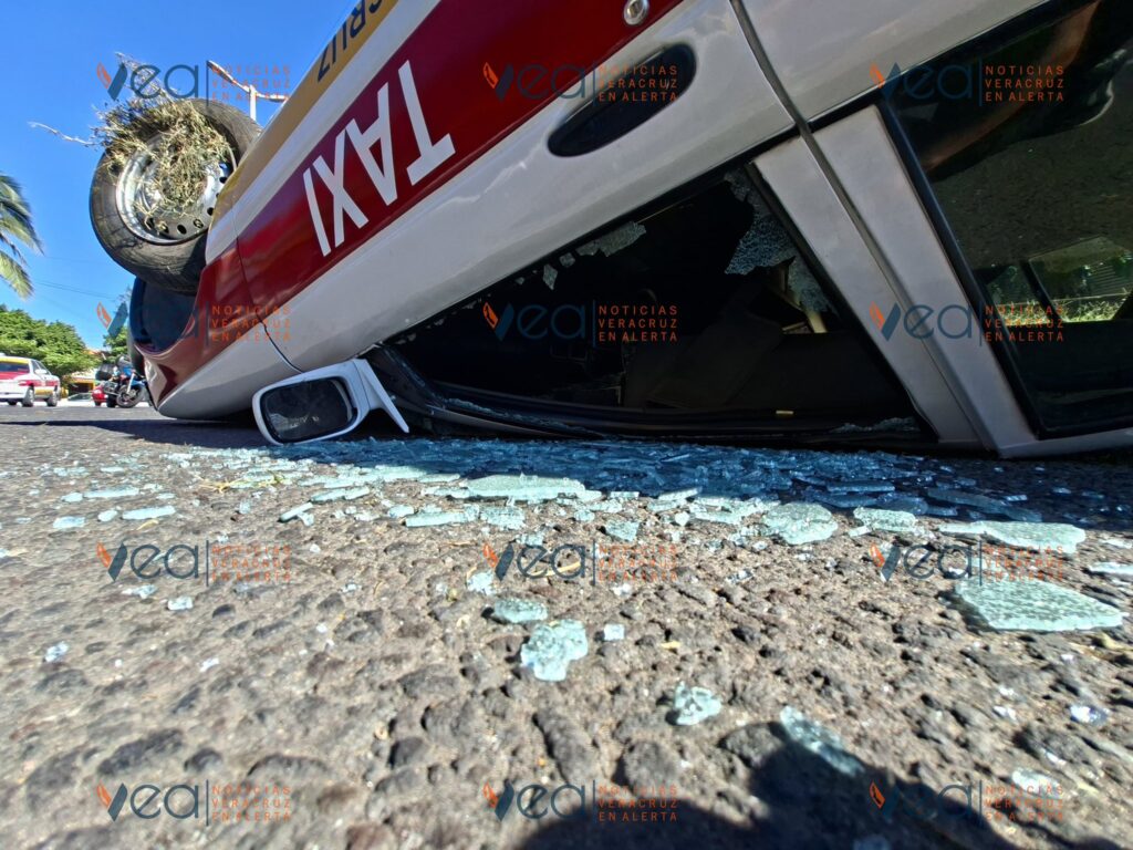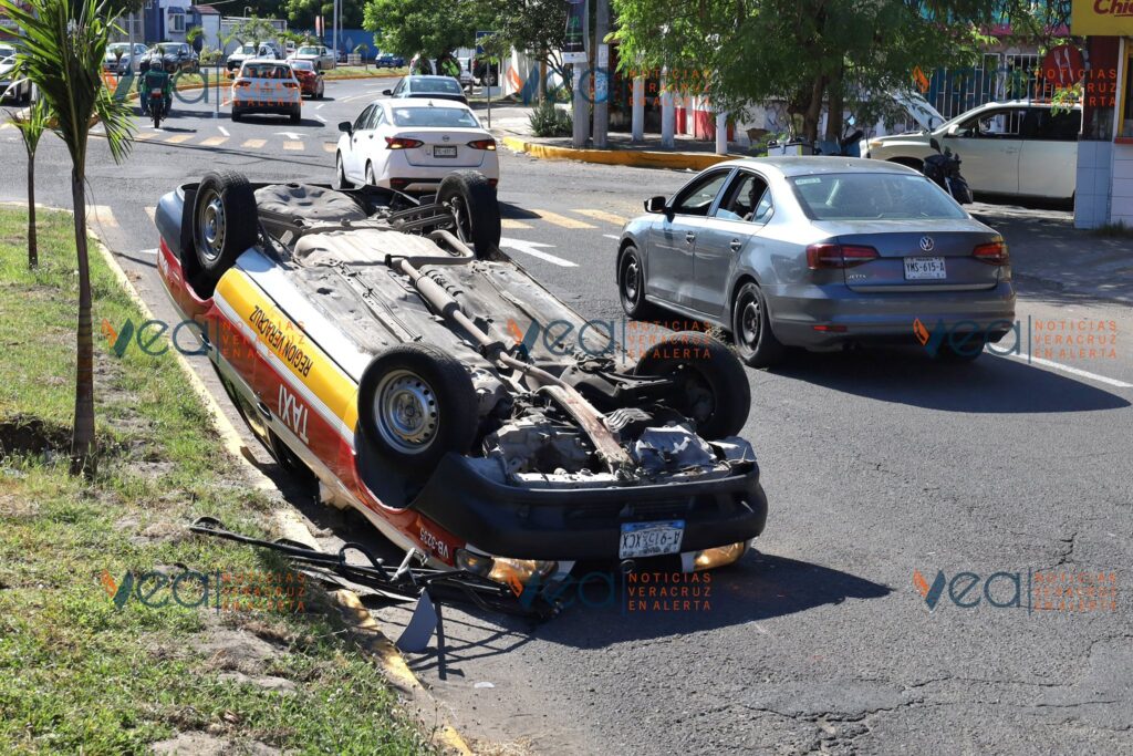 La tarde de este miércoles, un taxi con número económico VB-3235 volcó con las llantas hacia arriba en la avenida Miguel Ángel de Quevedo esquina Esteban Morales, en la colonia Centro de Veracruz.