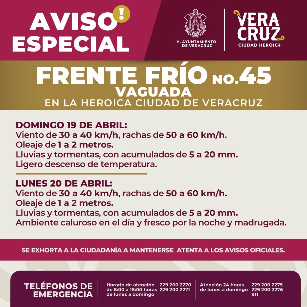 Protección Civil Municipal de Veracruz recomienda extremar precauciones ante el ingreso del Frente Frío 45, que provocará vientos, lluvias y oleaje elevado durante este domingo 19 y lunes 20 de abril.