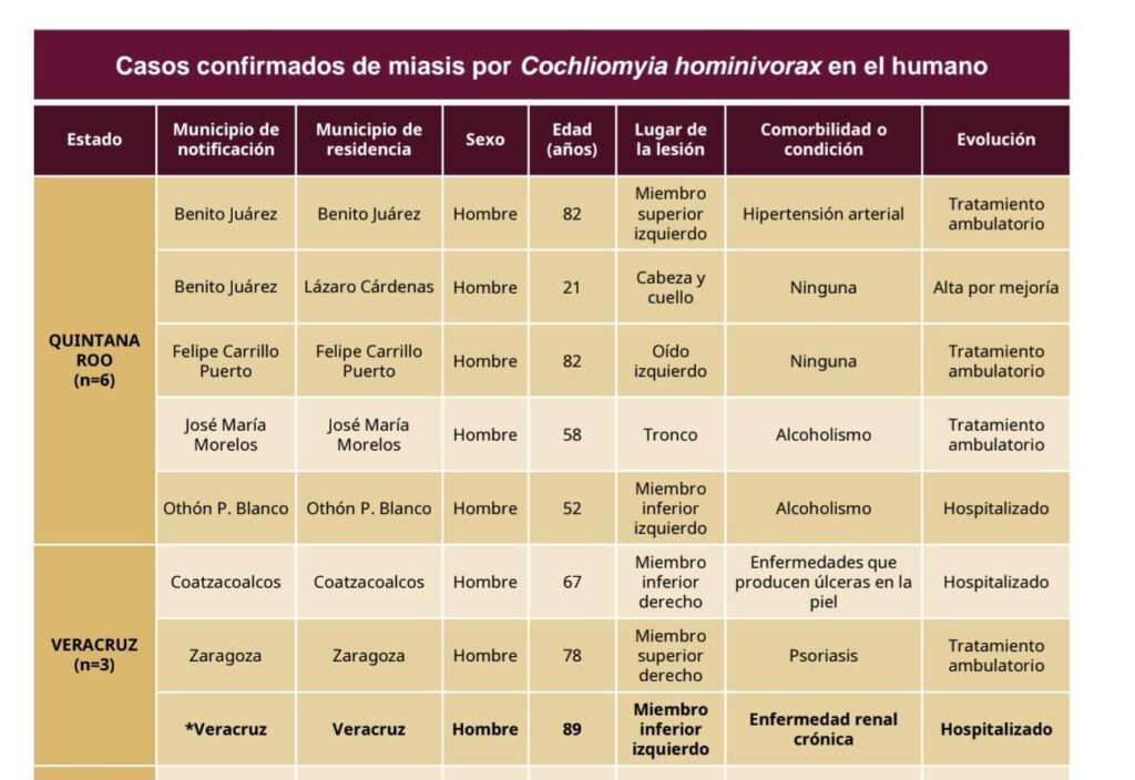 El primer paciente fue un hombre de 67 años originario de Coatzacoalcos, quien presentó una infección en la pierna derecha que requirió hospitalización inmediata debido a la presencia de larvas.
