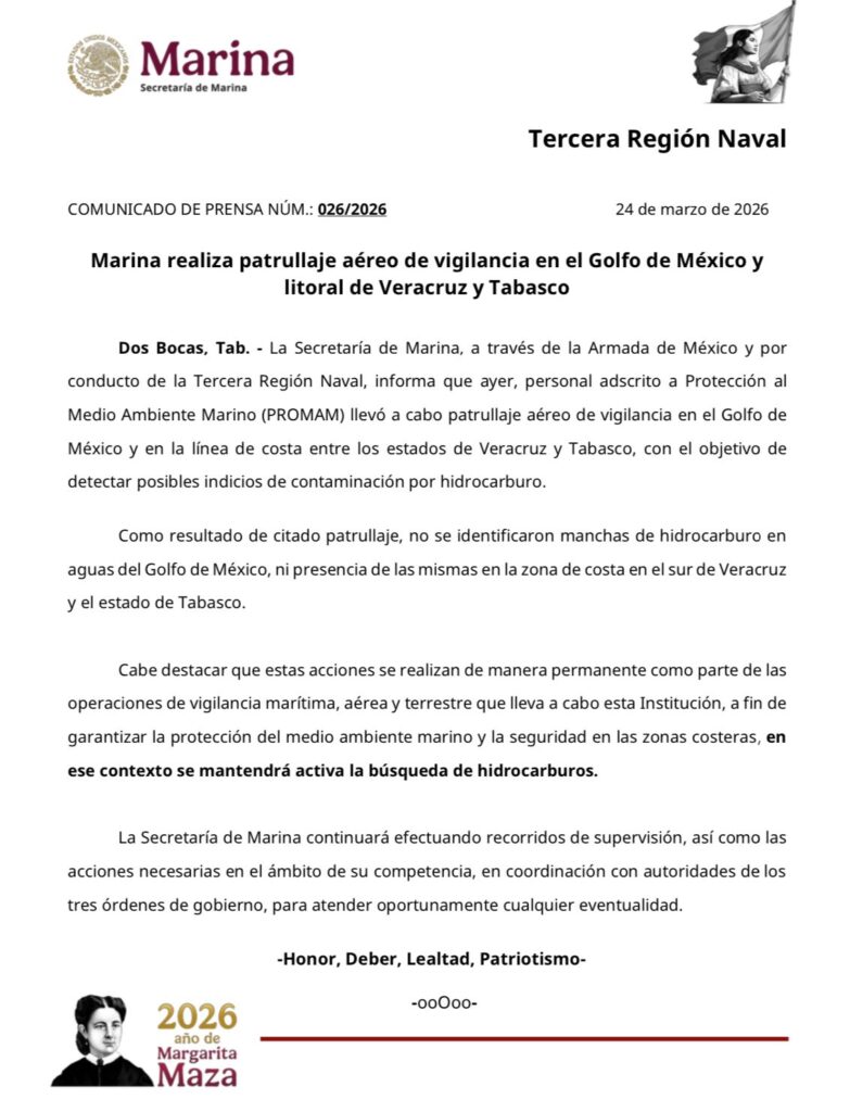24 de marzo de 2026. Veracruz | La Secretaría de Marina informó que tras realizar un exhaustivo patrullaje aéreo este lunes, no se detectaron indicios de contaminación por hidrocarburos en el Golfo de México.