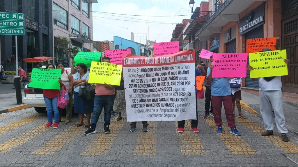 Ejidatarios de la ampliación del ejido Ranchoapan Segundo, perteneciente al municipio de San Andrés Tuxtla, protestaron cerrando el centro de la capital veracruzana, para exigir a la Secretaría de Desarrollo Agrario, Territorial y Urbano (SEDATU) el cumplimiento de un pago millonario que, aseguran, lleva años de retraso.